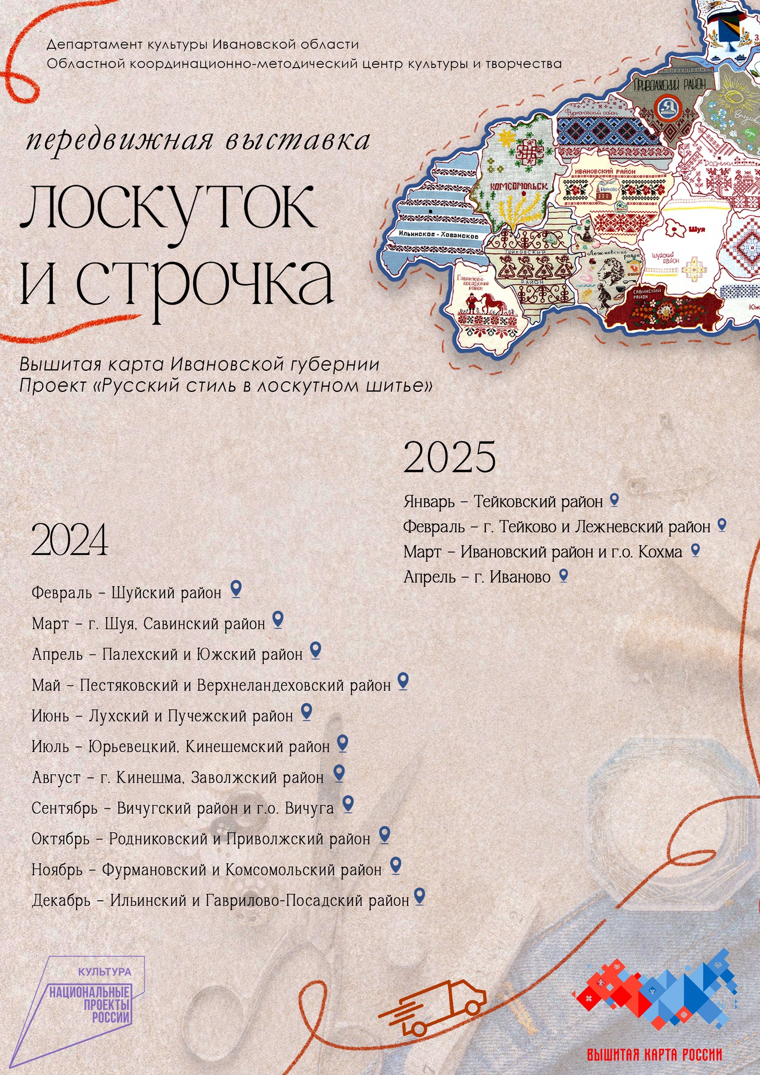Начиная с февраля 2024 года выставка «Лоскуток и строчка» побывала во всех 27 муниципалитетах Ивановской области.