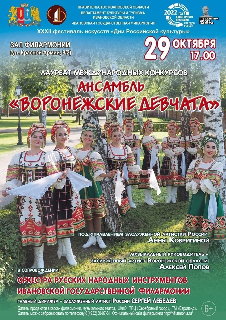 Большая совместная программа вокального ансамбля "Воронежские девчата" под руководством заслуженной артистки России Анны Ковригиной и оркестра русских народных инструментов Ивановской филармонии, главный дирижер - заслуженный артист России Сергей Лебедев