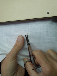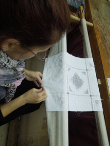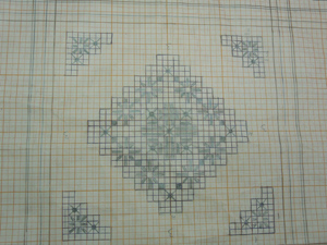 Сетка для рисунка. Подрезают нити противоположных рядов горизонтальной и вертикальной сторон и выдергивают их. Получается сетка для рисунка; после этого работу запяливают.