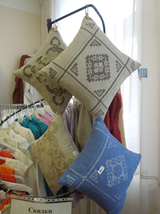 Пример работы в технике строчевышивального промысла старого и нового Пучежа нам показали в цехе ЗАО ПХП «Истоки» главный художник предприятия Людмила Аввакумовна Полуничева и вышивальщица Ирина Альбертовна Пантелеева.