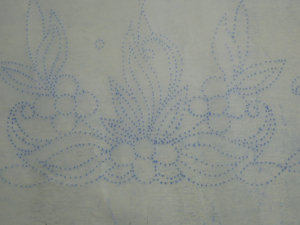 Сюжет будущей вышивки переносят на ткань с помощью трафарета. Рисунок наносится на кальку, линии прокалываются иглой частым пунктиром, затем трафарет накладывается на ткань, сверху губкой наносится краситель (самая обычная синька, смешанная со специальным маслом или, как вариант, с керосином). Состав просачивается в дырочки, и на ткани остается тончайший рисунок-трафарет.