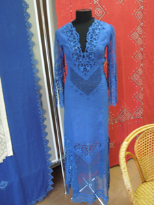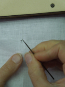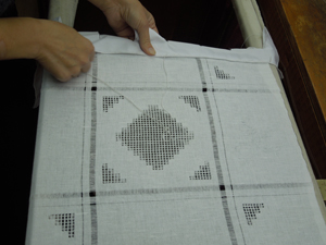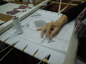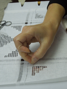 Работа вышивальщицы – зрелище завораживающее. Рука порхает над тканью и посторонний человек не сразу заметит, что это одна рука. Вторая постоянно находится внизу – чтобы ловить и выкалывать обратно иглу. Иголка используется маленькая, чтобы ее изготовить, отламывают половину обычной иглы и остро натачивают.