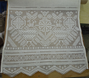 Держка мелкая. Через две-три нити (для сетки обычной перевити) намечают место сетки рисунка. Под прямым углом выдергивают по одной-две нити с обеих сторон; по выдернутым нитям набирают при помощи иголки на рабочую нитку, согласно рисунку, количество рядов с учетом сохранения строгой квадратности рисунка. Подрезают на двух сторонах нити набранных рядов, выдергивают из последних рядов, представляющих собой стороны прямого угла, по одной-две нити. Получается квадрат—граница для рисунка.