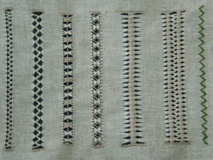 Мережка «настилом». Делают ее на основе мережки «столбик». Узор настилают мягкой ниткой штопальным швом: один столбик на иголку, другой под иголку; при возвращении нитки столбики поднимаются в обратном порядке. Процесс «настила» узора происходит в один прием сверху вниз и обратно. Каждую фигуру делают на восьми столбиках; в высоту она делится на четыре равные части с равным количеством рядов в каждой.