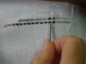 Мережка «кисточка» выполняется следующим образом: вкалывают иголку на расстоянии двух нитей от края снизу вверх; захватывают свободные нити в зависимости от толщины ткани, проводят нитку вверх, затем, протянув нитку через эти нити, вкалывают иголку снизу вверх в плотную ткань на расстоянии двух нитей от края; образуется косой стежок, которым нити стягиваются вместе. Следующие кисточки делаются так же.